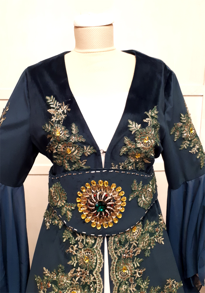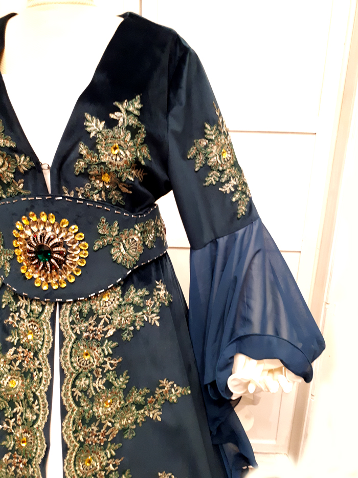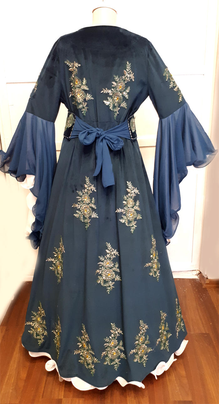 İpek kadife üzerine tel sarma sanatı aplike edilmiştir.  Gelin adaylarının kına gecesinde kullanabileceği şık bir kıyafettir.